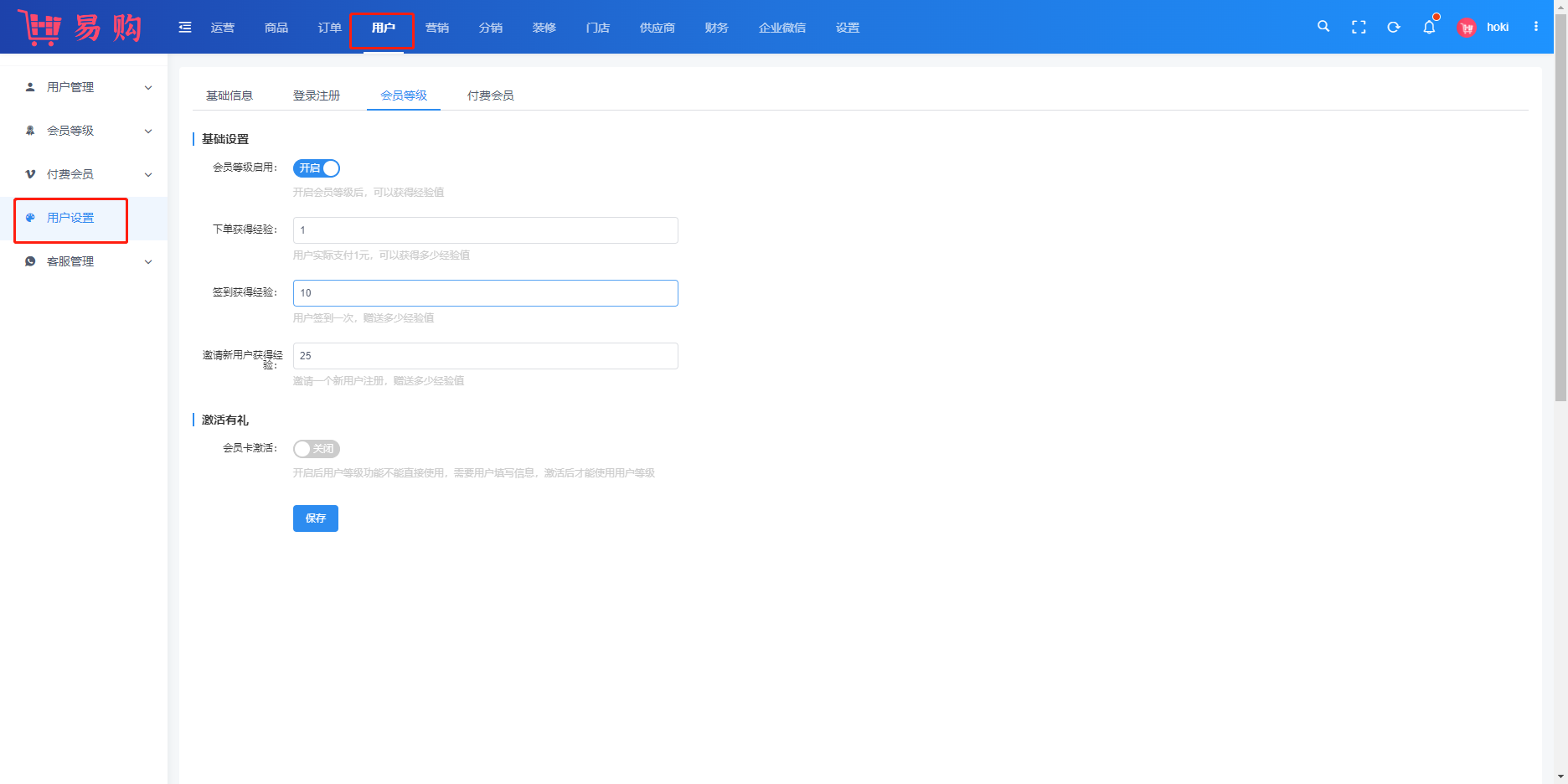 ##用户等级 ###一、功能介绍 商城的用户等级,是增强用户粘性的一个功能,用户可以通过邀请好友、签到等任务累积经验,通过经验提升等级,获得购物折扣优惠 ###二、操作流程 用户 > 会员管理 > 用户等级 ###三、功能说明 用户等级配置 位置:用户 > 会员管理 > 用户等级 经验配置 下单赠送用户经验比例 * 实际支付1元赠送多少积分,例:设置1,则消费1元,赠送1积分 #####签到赠送经验 * 用户签到后赠送经验值 * 经验值和签到赠送的积分大小无关 #####邀请新用户赠送用户经验值 * 新用户指第一次在商城注册的用户 * 根据用户的注册时间和首页登录时间判断是否为新用户  ####用户等级添加 每个等级可设置不同的折扣,当商品同时有等级折扣和付费会员特价时,下单时会选择付费会员价 每个等级需设置升级经验,例:v1等级经验设置为500,则用户的经验值达到500后升级为v1