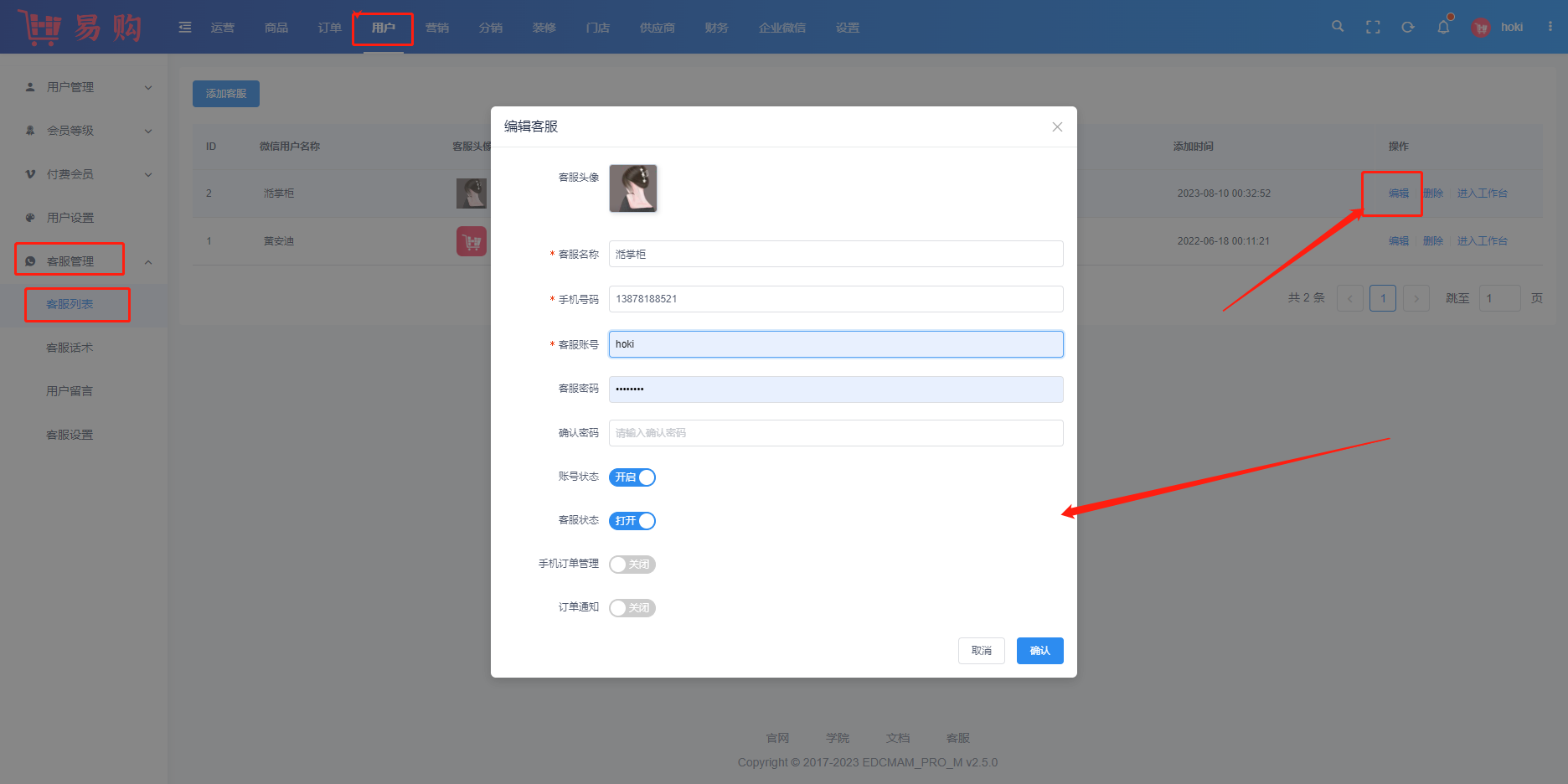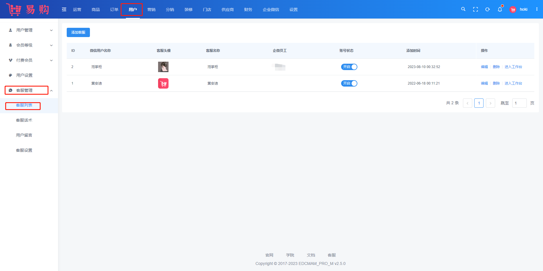 ##客服功能 ####功能提示: Pro v2.0系统采用swoole框架,客服不需要单独配置,按照正常安装流程配置好程序即可使用! 如出现客服无法使用,请检查:1.消息队列是否正常 2.重启swoole ###一、功能介绍 EDCMAM商城自带客服系统功能,客服可进行聊天、订单发送货、售后处理、接收提醒等多种功能 ###二、操作流程 用户 > 客服管理 > 客服列表  ###三、功能说明 ```sjon 商城用户:添加客服必须选择已关注使用过商城系统用户,且两天之类和商城有过互动的用户,否则将会导致无法接受消息通知提醒。 登录账号及密码,使用EDCMAM客服系统,可在手机端、PC端接受回复用户消息。 公众号内个人中心登录无法账号密码,根据用户信息直接登录。 PC端登录可采用扫码微信登录,或者账号密码登录。 ``` 客服账号状态说明: 账号状态:指的是该客服账号的总控制权限,关闭后则该账号处于被冻结,无法使用任何功能。 客服状态:指的是接收客户消息开关,关闭后则不会接收用户咨询消息。 手机订单状态:手机端订单操作管理,手机端操作发货、查看销量等权限。 订单通知:新订单消息通知  移动端客服入口