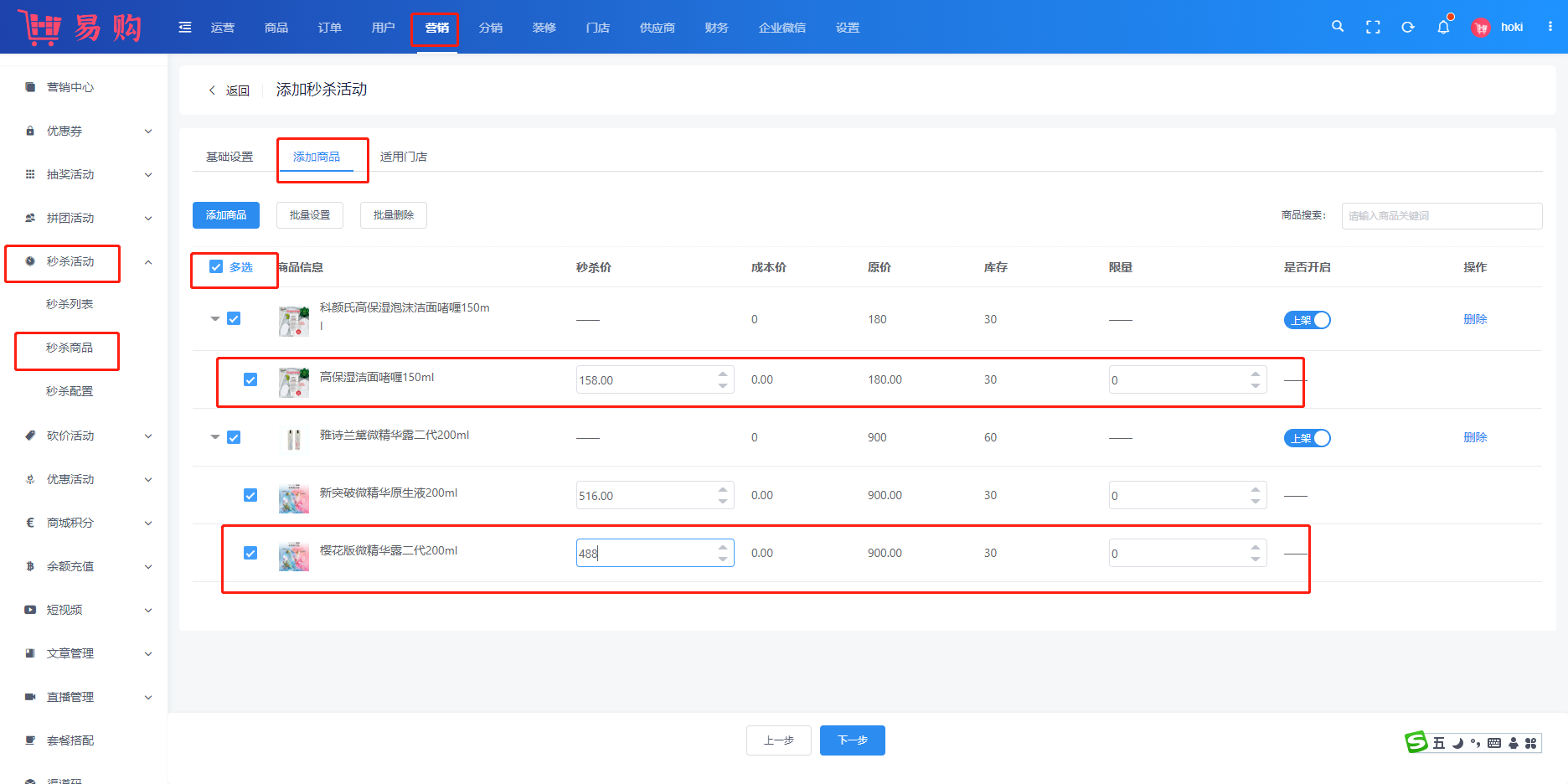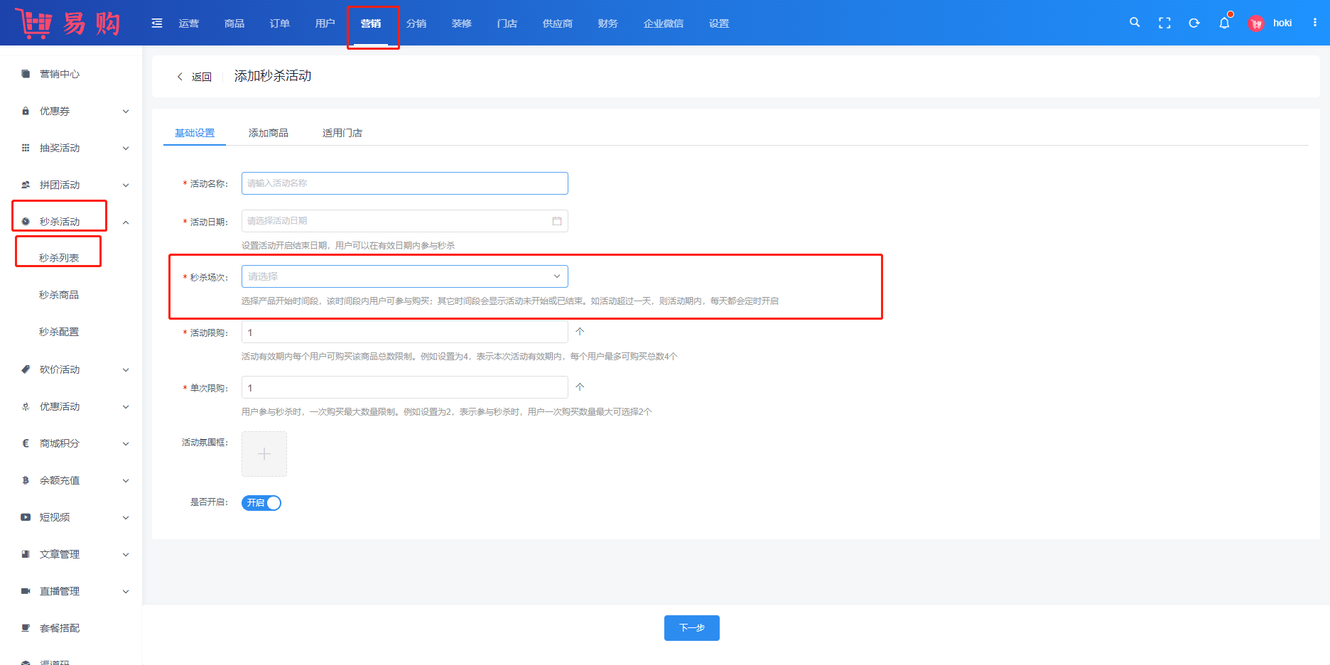 #秒杀(2.5及以后版本) ##秒杀 秒杀改为创建活动模式,⼀次活动可添加多个秒杀商品 秒杀时段可复选 ###1、功能介绍 批量选择多个商品开启一个秒杀活动,时间段可复选,能快速创建秒杀商品 ###2、操作流程 营销->秒杀活动->秒杀列表 时间段复选  多个商品  ###3、其他秒杀时间端、以及功能与2.5之前版本一致