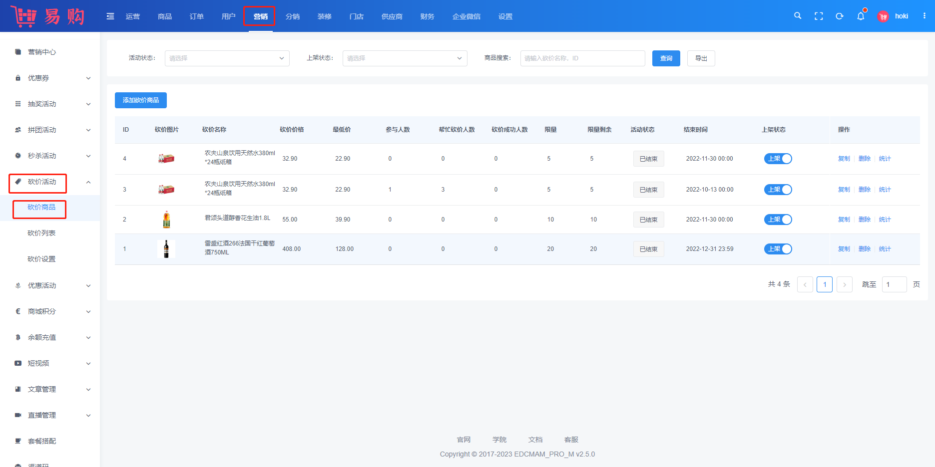 #砍价 ###一、功能介绍 可以自定义砍价人数、最低金额、活动有效期,实现快速拉新,线上推广裂变 ###二、操作流程 营销 > 砍价 > 砍价商品  ###三、功能说明 ####参与砍价 用户通过商城砍价列表,选择产品参与砍价活动。或者通过好友分享的砍价产品,参与砍价活动 ####要求帮忙砍价 将砍价产品链接或者砍价二维码海报(小程序商城)分享给好友,邀请好友帮忙砍价 ####砍价成功,下单购买 产品砍至系统设置价格时,砍价成功。支付相应金额,购买产品 ##⚠️ 注: ```sjon 砍价活动不参与分销返佣 砍价活动产品必须砍至最低价才能购买,例如:原价10元的产品,砍价最低价0元,用户砍价未砍到0元,不能支付购买产品。 砍价单次最小金额为0.01元,如砍价人数设置3人,商品价格最小为0.03元 ```