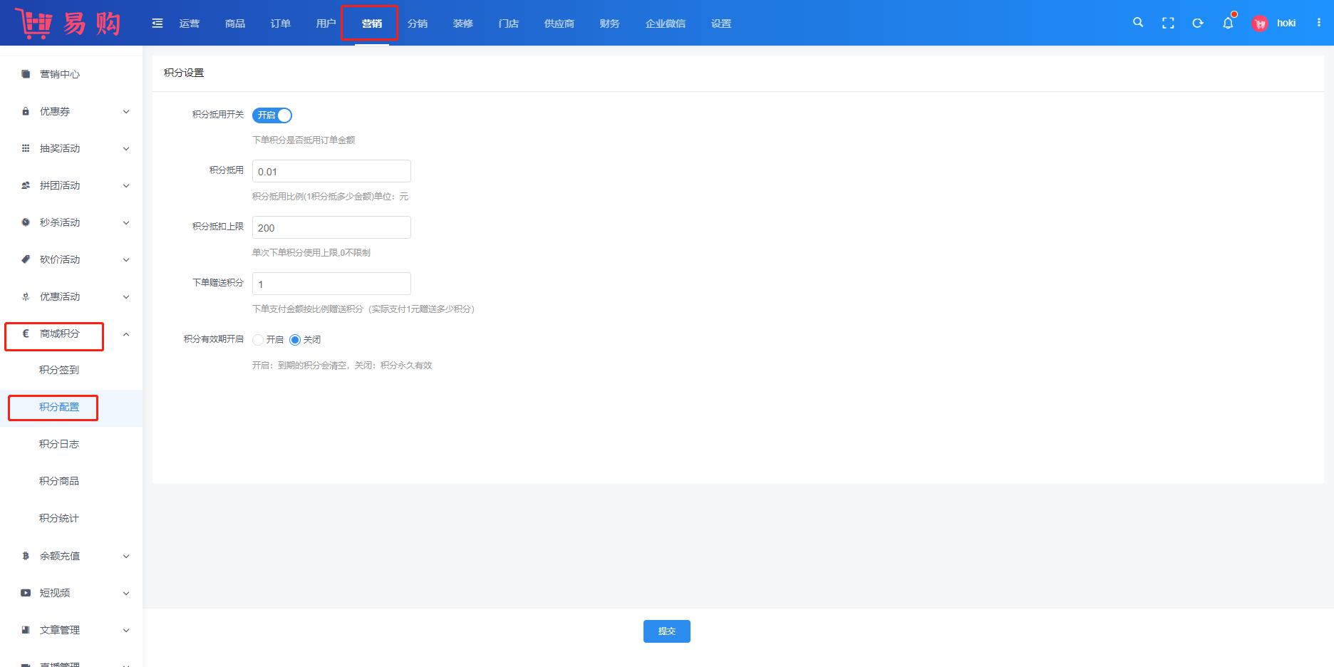 #积分介绍 ##积分 ###一、功能介绍 商城积分系统,用户可通过购买商品、签到等获得积分,积分可用来兑换商品、下单抵扣,助力提高客户的粘性与活跃度 ###二、操作流程 营销 >商城积分>积分配置  ###三、功能说明 积分来源 ```sjon 签到奖励 商品赠送 订单赠送 九宫格抽奖 ``` 积分使用 ```sjon 下单抵扣 积分兑换 九宫格抽奖 ```