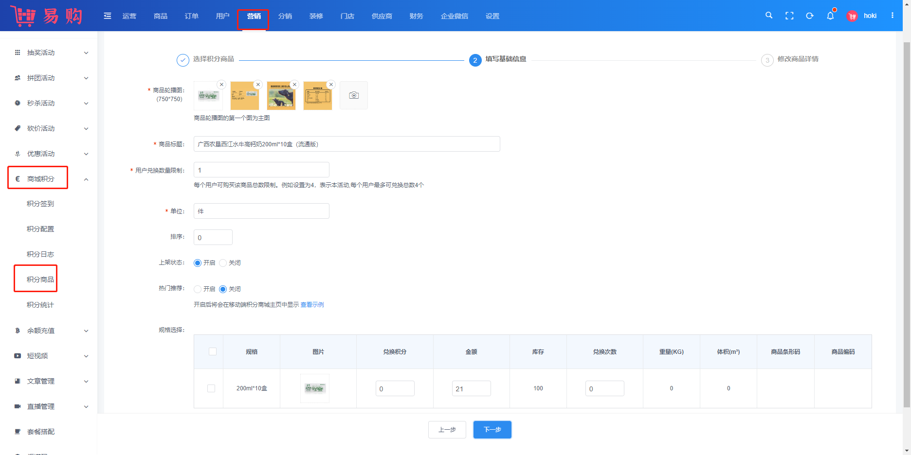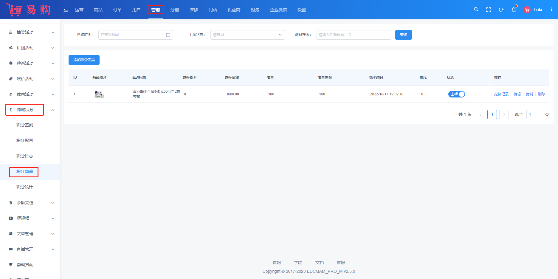 #积分商城 ###一、功能介绍 积分可用来兑换商品,助力提高客户粘性与活跃度 ###二、操作流程 营销 > 积分 > 积分商品/积分订单  ###三、功能说明 用户端 ```sjon 积分商城的商品,可使用积分兑换 商品兑换下单后,默认无运费 可设置每个用户兑换商品的上限 ```  添加积分商品 ```sjon 选择普通商品 设置积分商品信息 详情默认读取普通商品,也可单独修改 ```