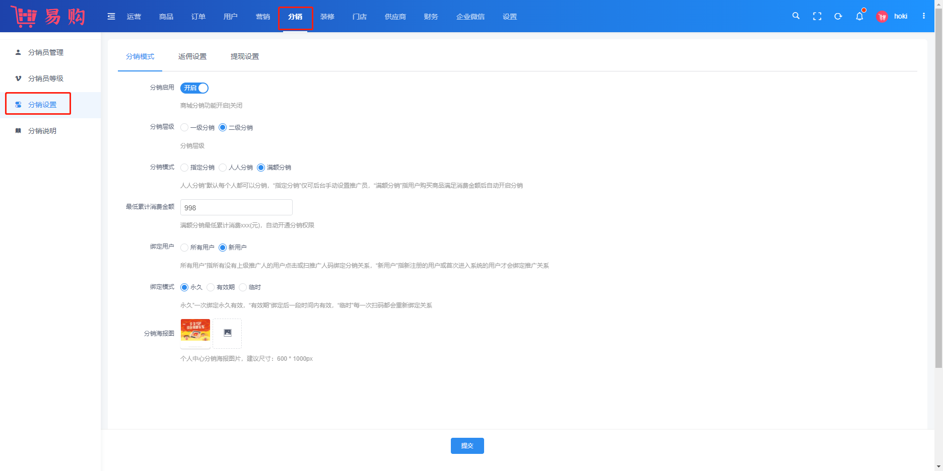 #分销介绍 ##一、功能介绍 裂变式分销,快速传播推广,多种分销模式体系,打造专属适合于您的运营 ##二、操作流程 分销 > 分销设置/分销等级/分销员管理  ##三、功能说明 ######1. 分销模式 ```sjon 分销模式:指定分销、人人分销、满额分销 指定分销:用户默认无分销权限,需要后台开通分销权限后,才可以通过推广下级获得返佣; 人人分销:用户在商城注册后自动获得分销权限; 满额分销:用户在商城消费购物达到开通分销的最低金额后,自动开通分销权限 满额分销门槛:后台可设置满XX元用户自动开通分销权限,已开通分销的用户不受后续消费金额要求变动影响,因此请谨慎设置消费金额要求,不要频繁更改! ``` 满额分销场景说明: ```sjon 后台设置满0元即可分销时,商城的用户均有分销权限,可分销推广 后台设置满200元可分销时,商城的用户需实际消费满200元才可开通分销权限 后台先设置满100元即可分销时,A在商城消费了100元,获得了分销权限;之后商城将消费条件设置为200元,A仍有分销权限; ``` 相同: 三种模式的推广方式、返佣方式均相同; 如果用户已是推广员,但没有上级时,可以绑定推广关系。 ######2. 分销层级 EDCMAM分销为一级或二级分销;分销固定两级,后台能自己选择分销层级 仅开启一级后仍然保留之前的分销关系,用户反佣仅一级 ######3. 返佣规则 ```sjon A推广B,B推广了C; A购买商品后,自己没有返佣; B购买商品后,A获得一级返佣; C购买了商品,B获得一级返佣,A获得二级返佣 ```  ####⚠️ 注:不返佣金的情况: ```sjon 用户没有推广员身份(指定分销情况下) 产品售价为0时,不返佣 下级用户购买拼团、砍价、秒杀商品时,没有返佣 下级用户购买商品后,没有确认收货时,暂不返佣;确认收货之后才会返佣 ```` ######4. 商品返佣 商品返佣分为 “默认返佣“ 和 “商品单独返佣“ 默认返佣 商城统一设置商品的返佣比例 (1)分销佣金仅和商品售价有关 (2)分销佣金和订单、优惠券抵扣、积分抵扣、实际支付金额、会员优惠价等无关 (3)商品佣金计算: 一级佣金 = 产品售价 \* 一级返佣比例 二级佣金 = 产品售价 \* 二级返佣比例 商品单独返佣 (1)每个商品可选择单独设置返佣 (2)每个商品规格设置一二级返佣 (3)单独设置后,商品的返佣以固定佣金为准,不受其他因素影响 5. 佣金冻结 佣金新增冻结期限,后台可设置冻结期,冻结的佣金不可提现,达到解冻时间后方可提现 冻结期从用户获得返佣时开始计算 冻结期设置为0时,则为无冻结期;冻结时间单位为 “天“ 6. 绑定推广关系 公众号、小程序:商品详情页(分享链接方式),产品海报(二维码分享),分销推广海报(二维码分享); H5商城:产品海报,分销推广海报; 说明:用户通过这些方式进入商城后,必须授权或者注册(H5)之后才会绑定关系 当用户已有上级、用户进入商城未授权或注册、用户已经是推广员(指定分销模式),不能绑定推广关系 用户之前访问过商城,但没有上级时,可以绑定推广关系 7. 解除推广关系 解除推广关系 可以清除上级关系,不能清除下级关系 推广关系绑定与分销模式无关 商城由人人分销转为指定分销时,用户之间的上下级关系不变,没有推广员身份的用户不再记录返佣; 商城由指定分销转为人人分销时,上下级关系不变,返佣不变。 推广订单问题 用户之间的上下级关系解除之后,推广员之前记录的推广订单依然保留,之后下级消费的订单因推广关系已解除所以不再记录
