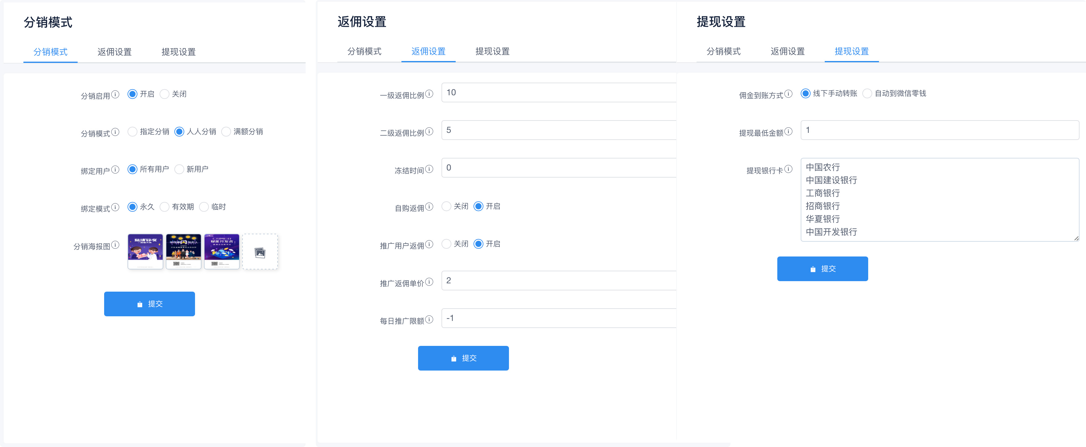#分销配置 ##一、分销模式 ###分销模式 ####人人分销、指定分销、满额分销 #####分销关系绑定 所有用户:所有无上级的用户均可绑定; 新用户:仅有新注册的用户可绑定 #####绑定时间 永久 上下级绑定期限永久有效 #####有效期 可设置绑定的有效期限,过了有效期之后,下级可更换其上级推广人 #####临时 推广关系临时有效,当下级扫别的推广员二维码后,之前的推广关系即解除 #####满额分销最低金额 当分销模式使用满额分销时,可设置分销门槛;当设置为0元时,每个用户均可分销,设置为100元时,用户消费满100元才会开通分销权限 ##二、返佣设置 #####默认返佣设置 设置一二级返佣百分比,例如:一级佣金设置为 20,则一级返佣比例为20% #####冻结时间 可设置返佣后的佣金冻结期,冻结的佣金不可提现,达到解冻时间后方可提现;冻结期从用户获得返佣时开始计算 #####自购返佣 用户自己购买商品,可获得一级返佣,用户的上级获得二级返佣 #####推广用户返佣 ```sjon 推广新用户,可设置额外的返佣 可设置推广用户的返佣单价 可设置每日最高推广金额 ```` ##三、提现设置 #####微信提现 微信自动提现到零钱,后台审核通过用户的提现申请后,自动从微信的公户转帐到用户零钱 #####提现最低金额 提现金额满足最低的金额要求后,才可提现 #####提现银行卡 填写用户申请佣金时可选择的银行,按回车键可继续填写