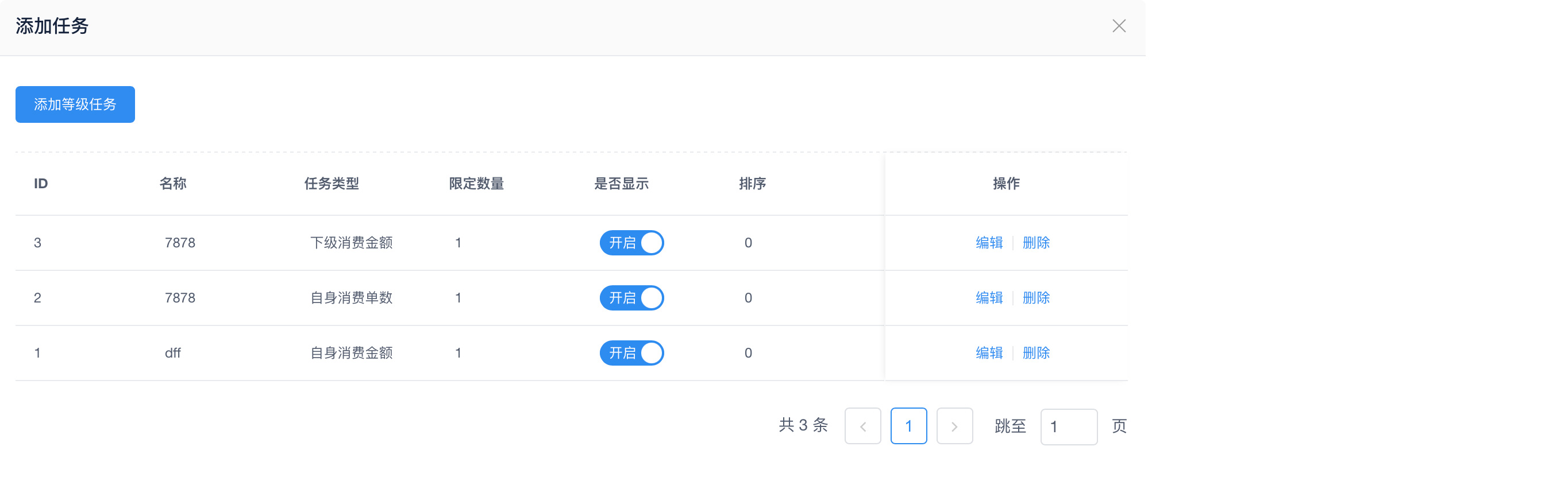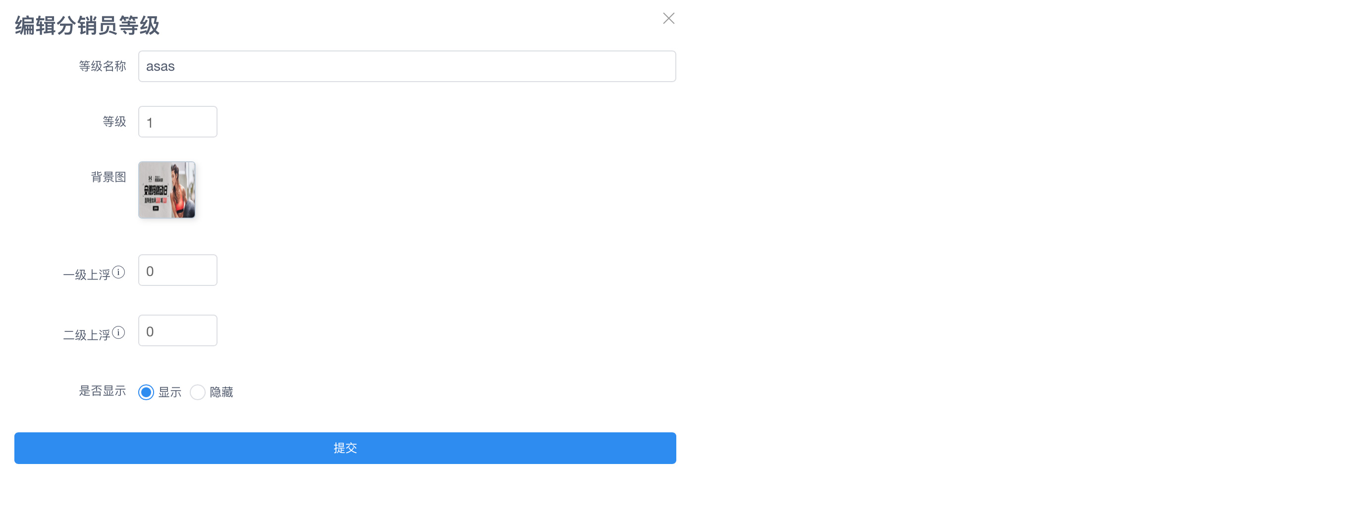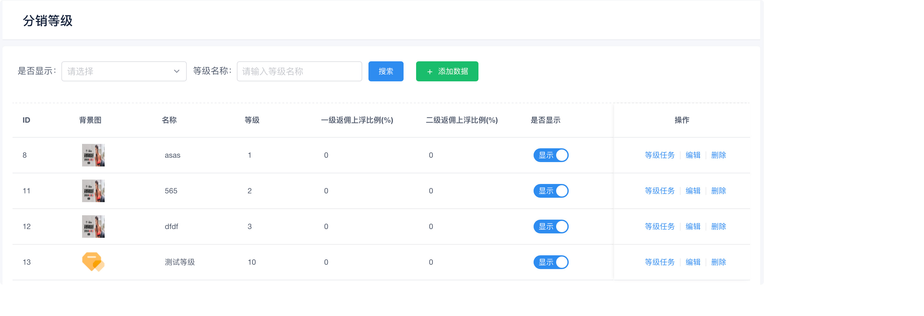 #分销等级 ##一、功能介绍 创建分销等级,推广员可完成任务升级等级,享受更多的推广优惠政策,刺激推广员的推广意愿 ##二、操作流程 分销 > 分销等级 ##三、功能说明 ####设置分销员等级  ####设置等级任务  ####设置佣金上浮比例 上浮比例是佣金计算出来后的上浮比例 假如基础佣金比例 10% 售价 100 佣金 100*10% = 10 如果当前等级设置上浮10% 那最终的返佣金额就是10 + 10 * 10% = 11