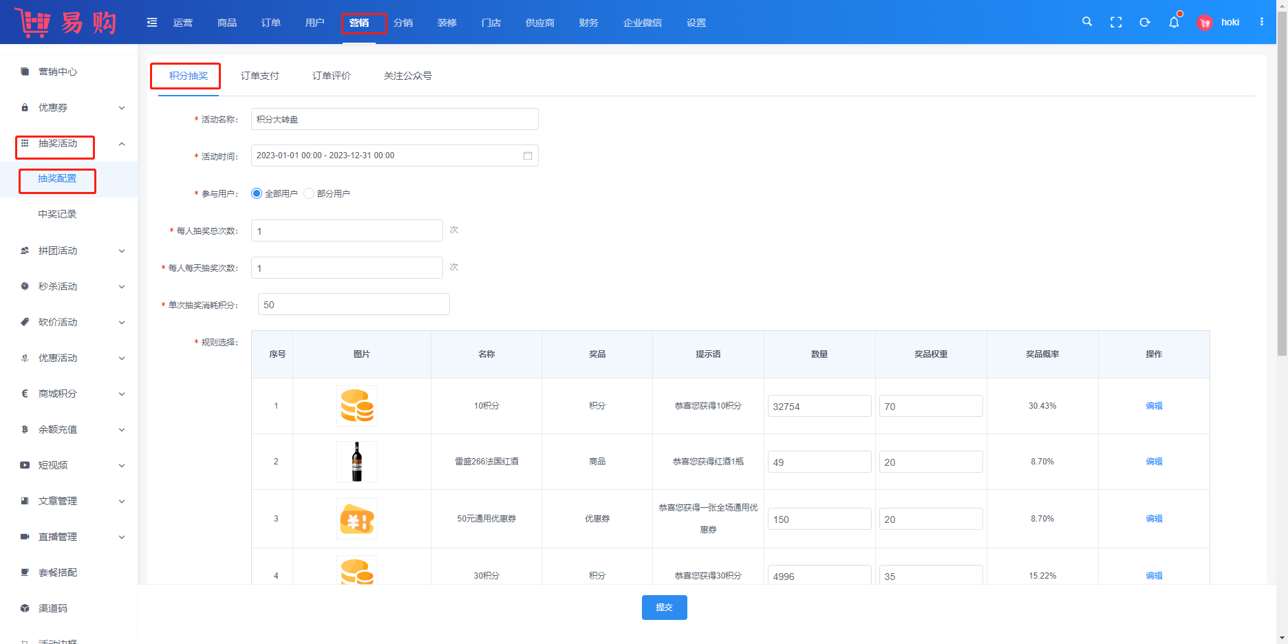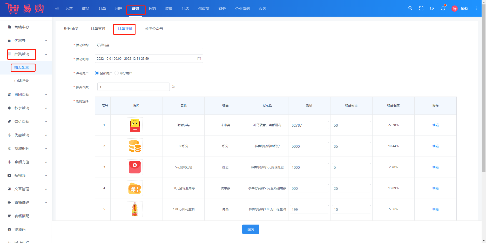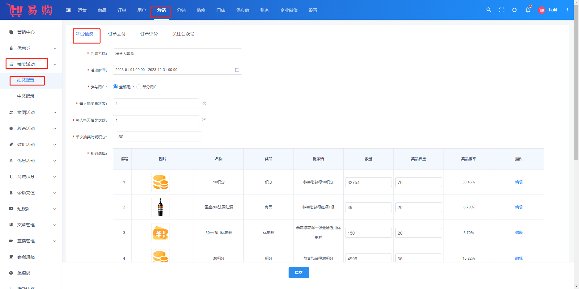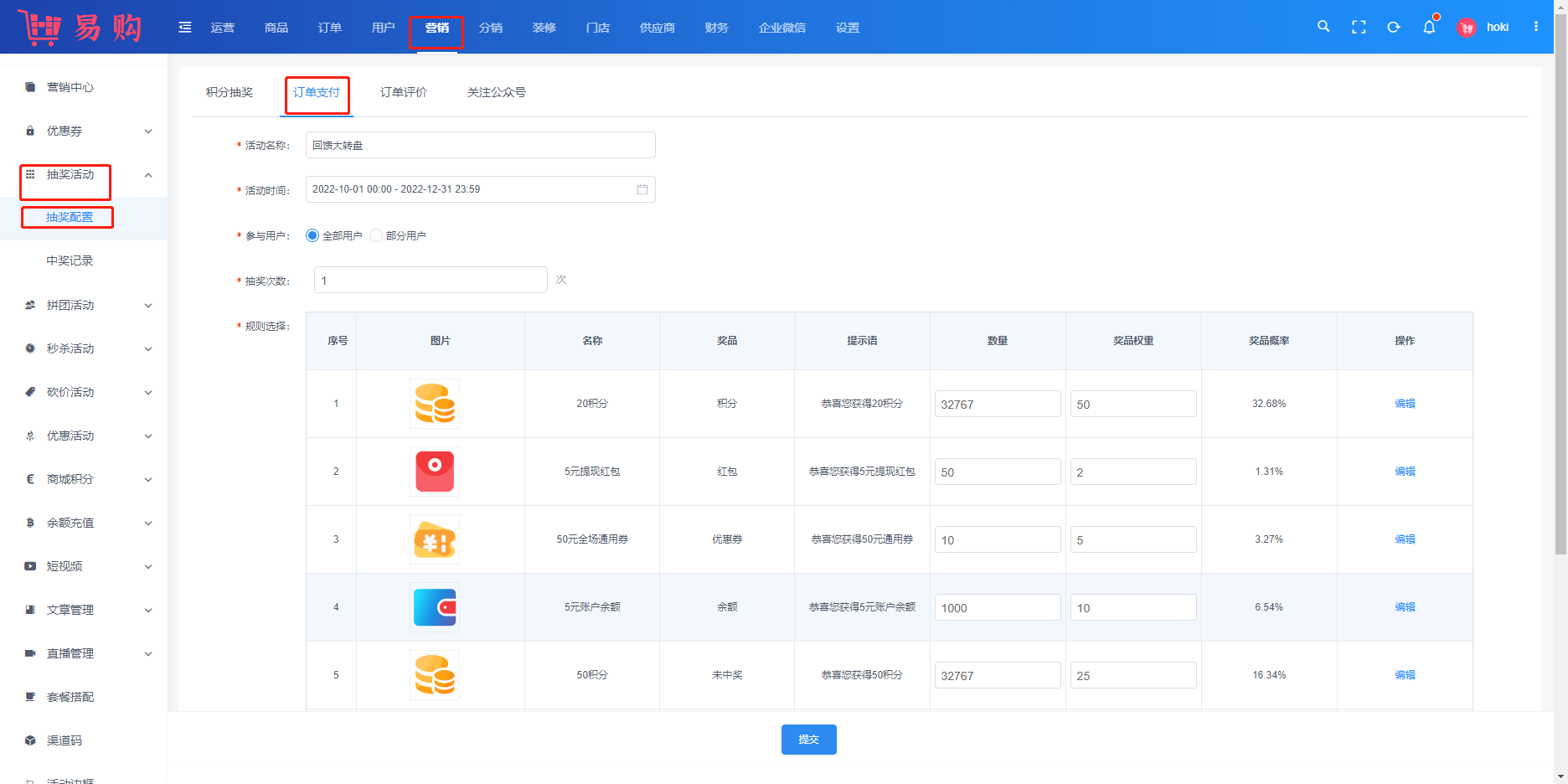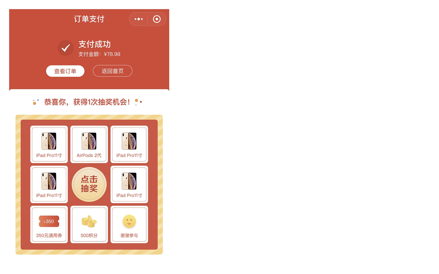 ##抽奖配置 ###一、功能介绍 抽奖活动凭借着以小博大的杠杆效应、低门槛参与、高奖励诱惑的活动机制,无论是线下门店促销,还是线上活动,都被广泛用于拉新、促活、获客等增长环节。 我们采用了九宫格抽奖的方式,后台可设置8个奖品,可自由调节奖品的中奖概率;在关注公众号、商城的多个环节、以及积分消耗等多处,均可设置抽奖活动 ###二、操作流程 营销 > 抽奖活动> 抽奖配置  ###三、功能说明 ####(1)商品评价抽奖(2)下单支付抽奖(3)关注公众号抽奖(4)积分抽奖 1. 商品评价抽奖 ```sjon 用户评价商品后,可参与抽奖 一个订单有多个商品时,每次评价都可抽奖 ```  移动端展示  2. 下单支付抽奖 ```sjon 用户成功下单后,可参与抽奖 仅限购买商城商品,购买积分商城的商品不参与抽奖 ```  移动端展示  3. 关注公众号抽奖 ```sjon 用户关注商城公众号后,可参与抽奖 用户第一次关注公众号才会获得抽奖资格 用户可通过邀请好友关注公众号增加抽奖次数 ```  移动端展示  4. 积分抽奖 用户可通过消耗积分来抽奖,系统自动计算用户的积分可抽奖次数  移动端展示  ###四、创建活动 #####1. 活动信息设置 (1)选择活动时间 (2)选择活动类型 积分抽奖:设置每次抽奖消耗的积分数额 订单支付:设置可抽奖的次数 商品评价:设置用户评价后可抽奖的次数 关注公众号:用户默认有一次抽奖次数,用户可邀请好友关注公众号获得抽奖次数,可设置获得抽奖次数的上限  #####2. 活动奖品设置 (1)默认有“未中奖“的设置 (2)奖品类型: ```sjon 优惠券:选择的优惠券为赠送券 积分:中奖后自动发放到用户的积分账户 商品:选择的商品不能选择规格,需要在商品名称或活动规则中说明 红包:需开通商户自动到零钱功能才可使用 余额:中奖后自动发放到用户余额账户 ```  #####3. 活动模块设置 关注公众号/积分抽奖,可设置活动页面的背景图、中奖名单、个人中奖记录、活动规则等,可在活动规则中展示此次抽奖活动的奖品信息、活动说明等