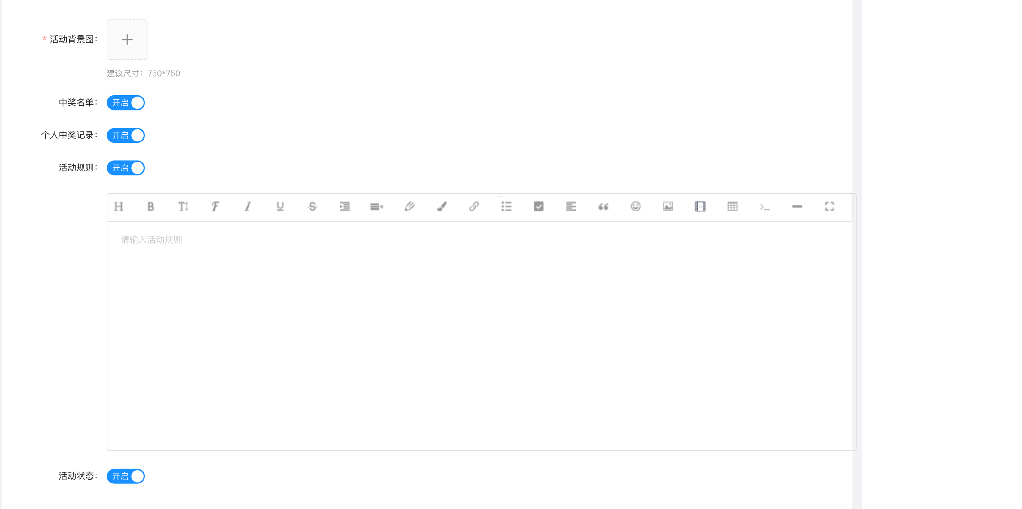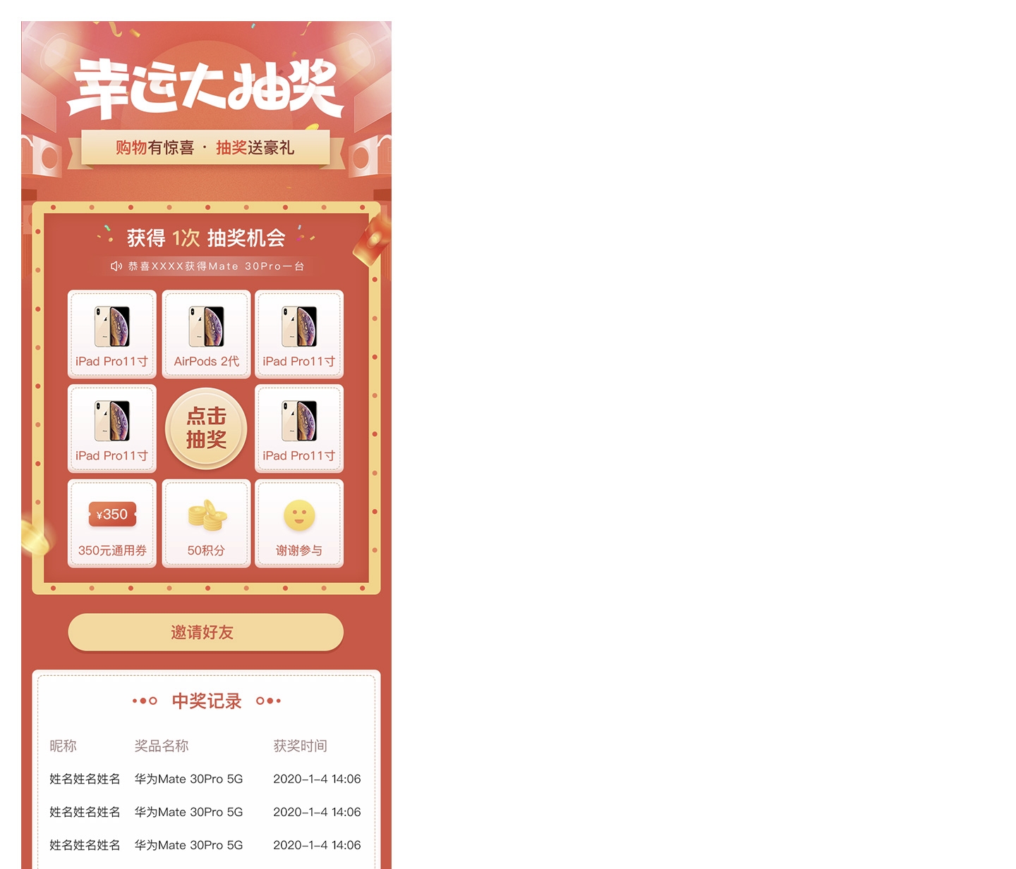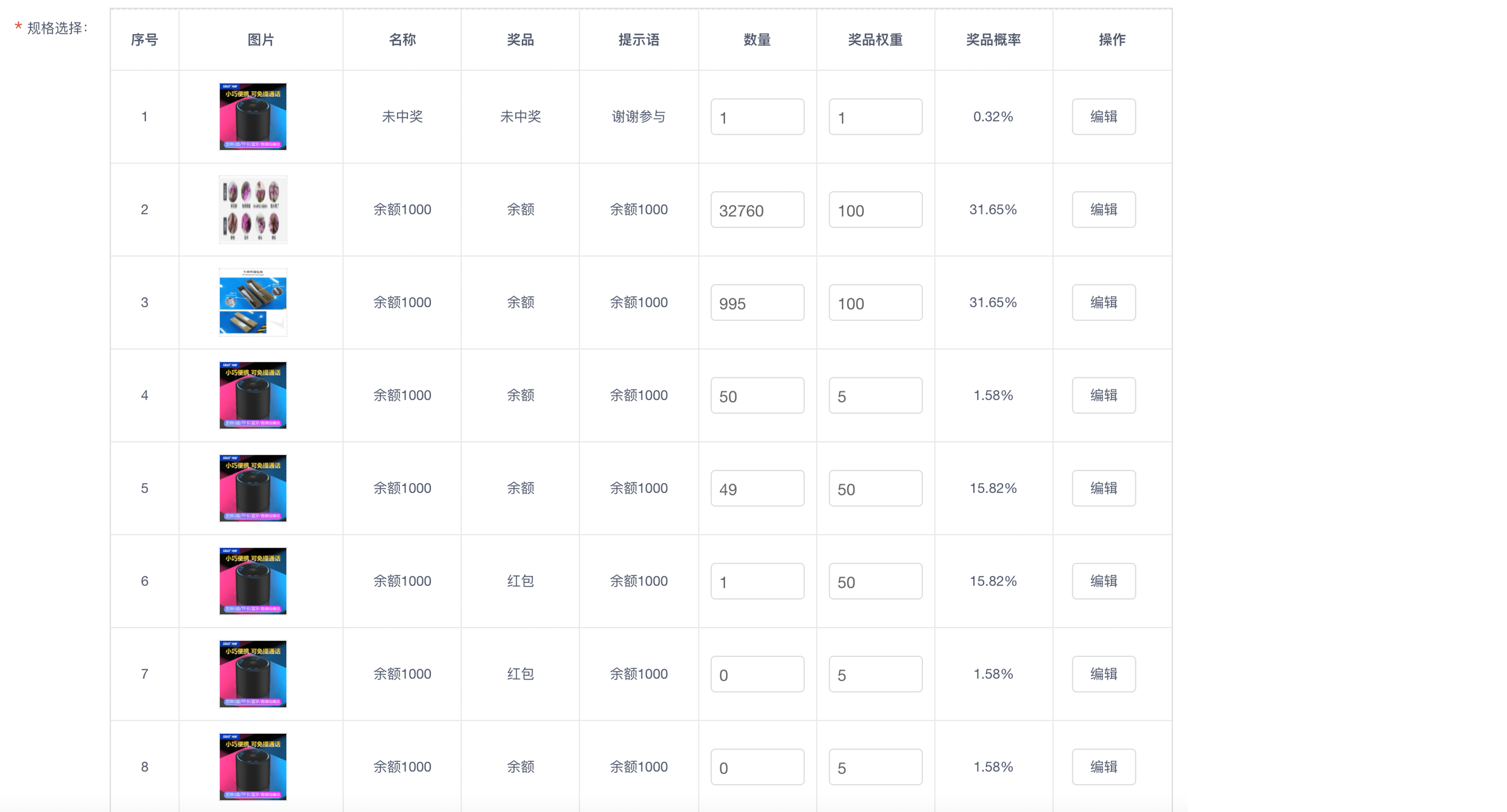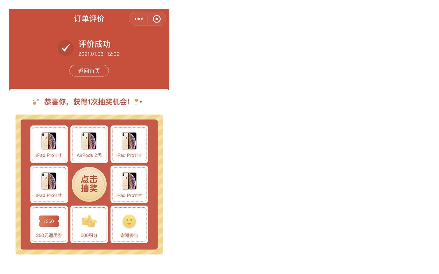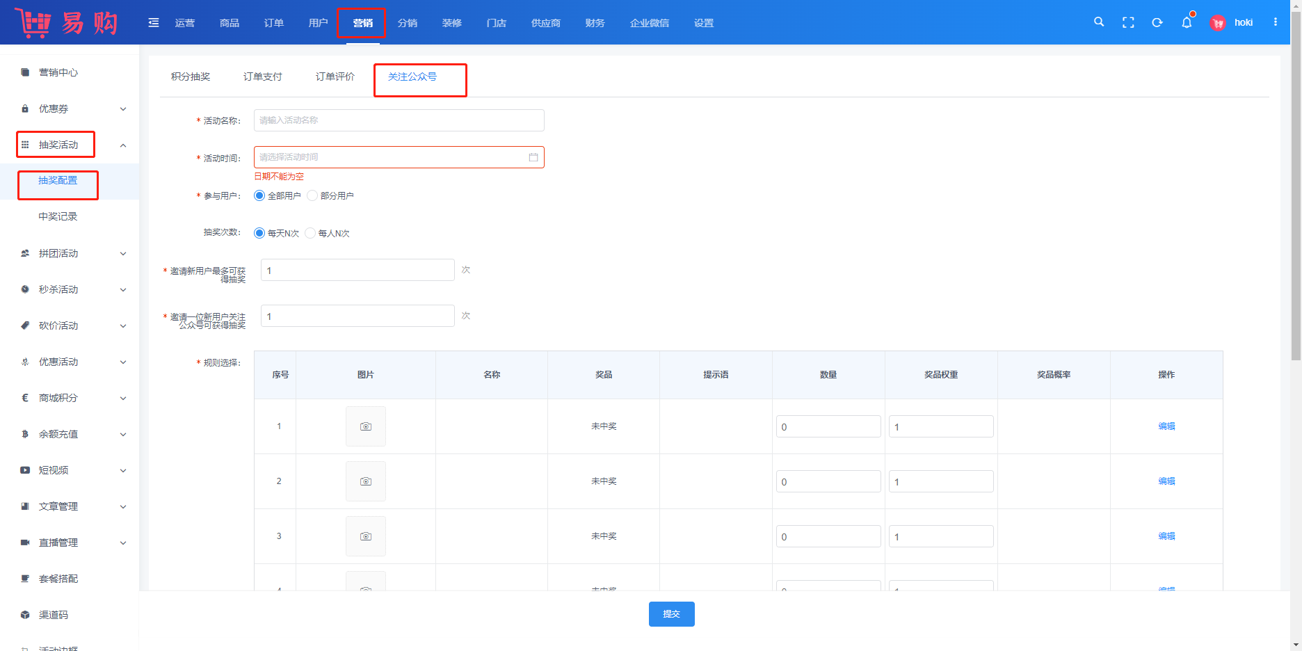 ##抽奖配置 ###一、功能介绍 抽奖活动凭借着以小博大的杠杆效应、低门槛参与、高奖励诱惑的活动机制,无论是线下门店促销,还是线上活动,都被广泛用于拉新、促活、获客等增长环节。 我们采用了九宫格抽奖的方式,后台可设置8个奖品,可自由调节奖品的中奖概率;在关注公众号、商城的多个环节、以及积分消耗等多处,均可设置抽奖活动 ###二、操作流程 营销 > 抽奖活动> 抽奖配置  ###三、功能说明 ####(1)商品评价抽奖(2)下单支付抽奖(3)关注公众号抽奖(4)积分抽奖 1. 商品评价抽奖 ```sjon 用户评价商品后,可参与抽奖 一个订单有多个商品时,每次评价都可抽奖 ```  移动端展示  2. 下单支付抽奖 ```sjon 用户成功下单后,可参与抽奖 仅限购买商城商品,购买积分商城的商品不参与抽奖 ```  移动端展示  3. 关注公众号抽奖 ```sjon 用户关注商城公众号后,可参与抽奖 用户第一次关注公众号才会获得抽奖资格 用户可通过邀请好友关注公众号增加抽奖次数 ```  移动端展示  4. 积分抽奖 用户可通过消耗积分来抽奖,系统自动计算用户的积分可抽奖次数  移动端展示  ###四、创建活动 #####1. 活动信息设置 (1)选择活动时间 (2)选择活动类型 积分抽奖:设置每次抽奖消耗的积分数额 订单支付:设置可抽奖的次数 商品评价:设置用户评价后可抽奖的次数 关注公众号:用户默认有一次抽奖次数,用户可邀请好友关注公众号获得抽奖次数,可设置获得抽奖次数的上限  #####2. 活动奖品设置 (1)默认有“未中奖“的设置 (2)奖品类型: ```sjon 优惠券:选择的优惠券为赠送券 积分:中奖后自动发放到用户的积分账户 商品:选择的商品不能选择规格,需要在商品名称或活动规则中说明 红包:需开通商户自动到零钱功能才可使用 余额:中奖后自动发放到用户余额账户 ```  #####3. 活动模块设置 关注公众号/积分抽奖,可设置活动页面的背景图、中奖名单、个人中奖记录、活动规则等,可在活动规则中展示此次抽奖活动的奖品信息、活动说明等
