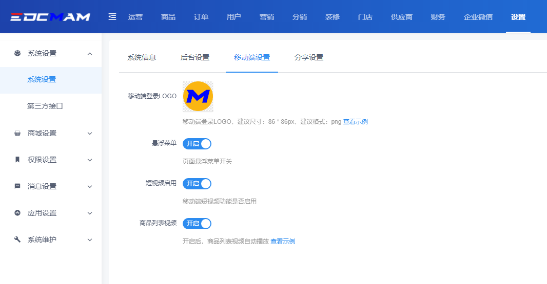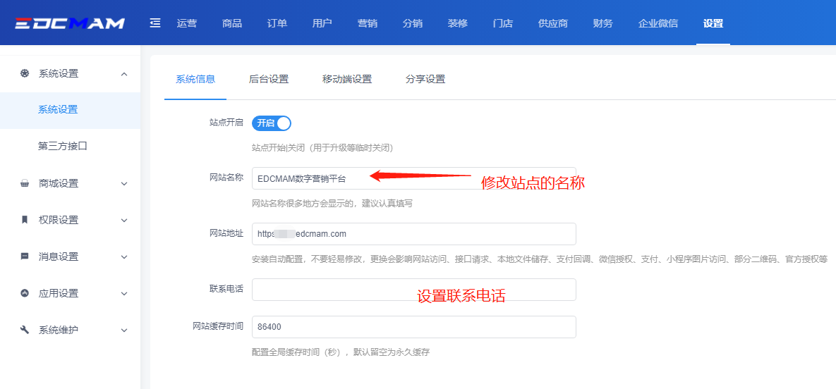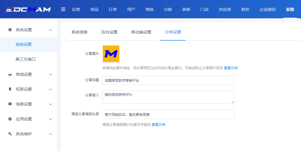 在【设置】-【系统设置】-【系统设置】中,对【系统信息】、【后台设置】、【移动端设置】、【分享设置】等位置进行系统的内容设置。
