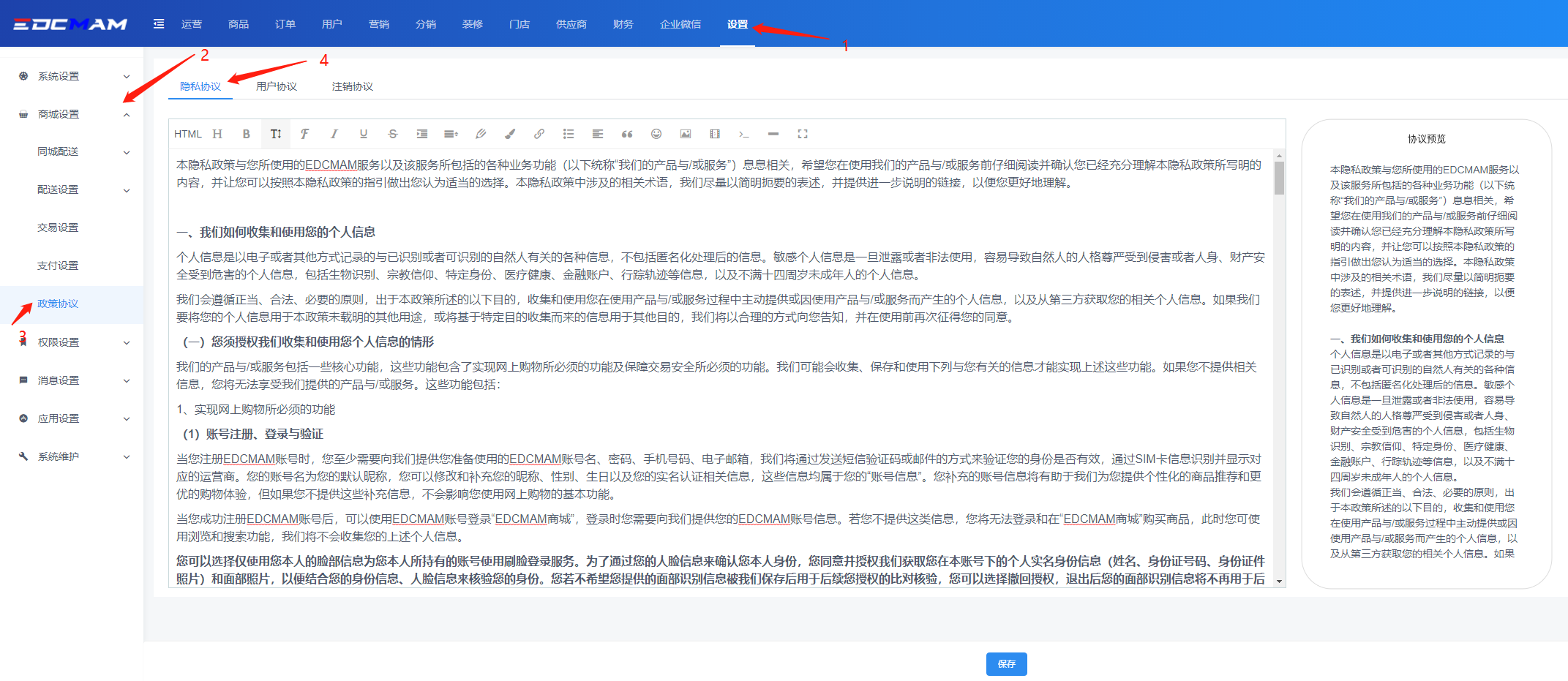 在【设置】-【商城设置】-【政策协议】中,设置系统的隐私协议、用户协议、注销协议等。