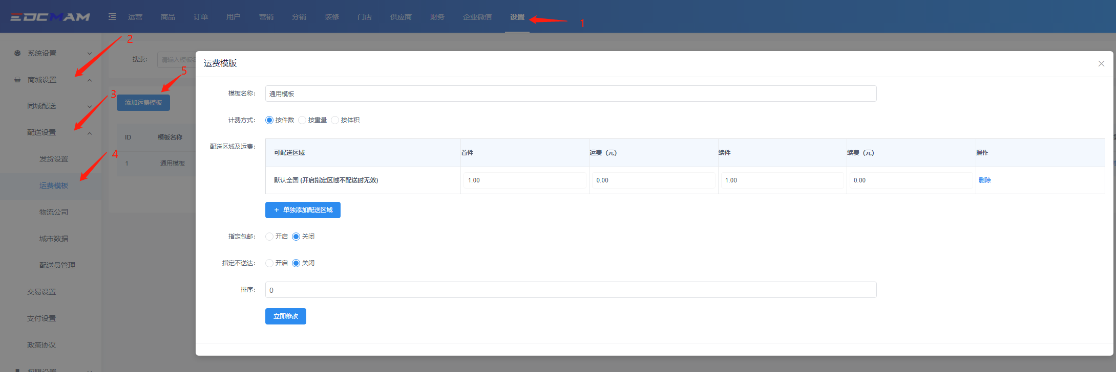 在【设置】-【商城设置】-【配送设置】-【运费模板】中,设置好运费模板