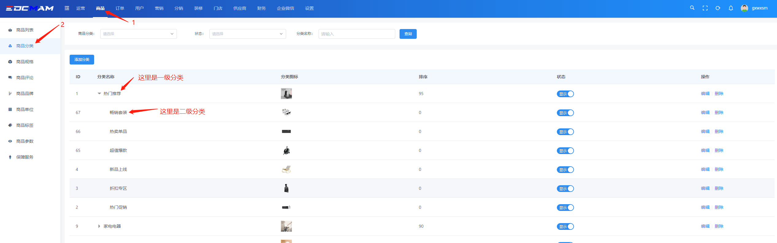 商品的上架。在添加商品前,先在【商品】-【商品分类】中设置商品的分类(建议二级)。
