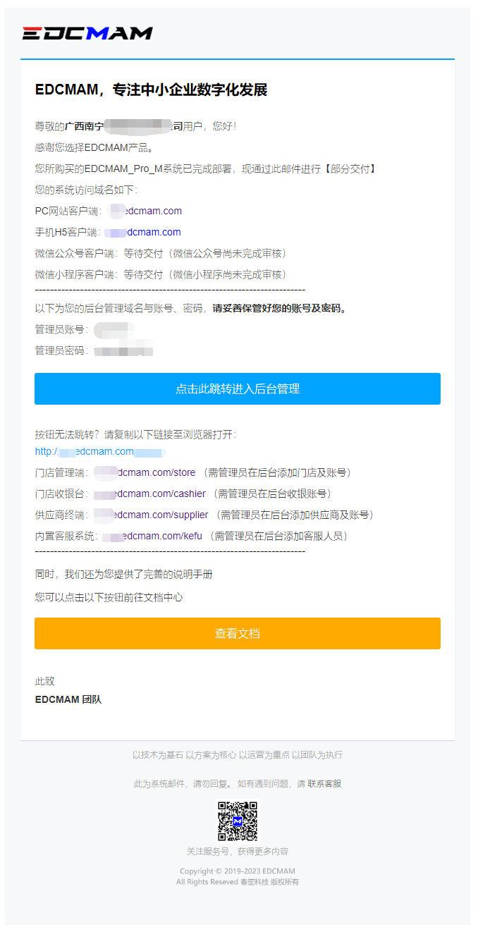 系统完成验收后,EDCMAM将通过support@edcmam.com下发电子邮件,将您平台的访问地址及账号、密码发送至您签署合同时预留的邮箱。