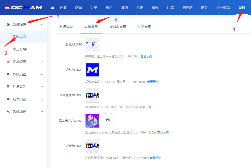 在【后台设置】中,可将各位置的Logo替换成自己的