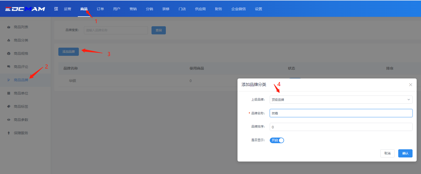 品牌管理设置详见:http://doc.edcmam.com/EDCMAM_Pro_Mer/Pro_mer/298
