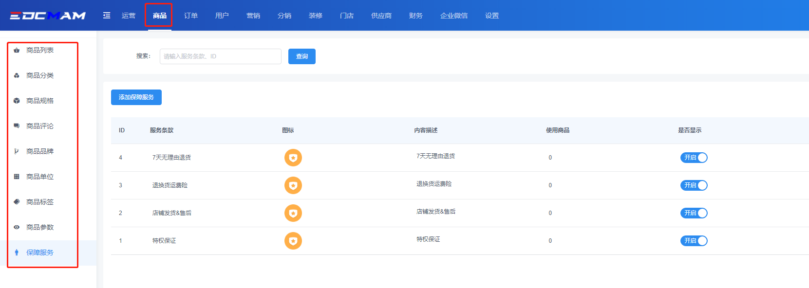 商品保障设置详见:http://doc.edcmam.com/EDCMAM_Pro_Mer/Pro_mer/303