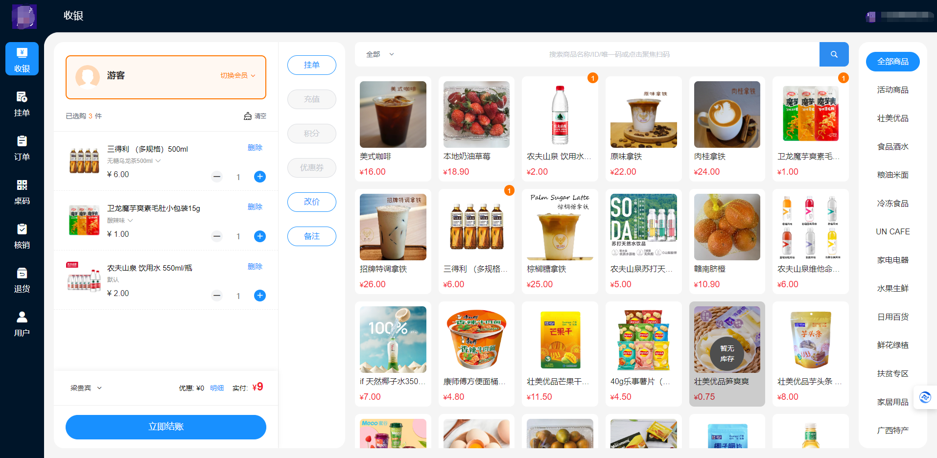###四、板块说明 ###购物车  ###临时挂单区 ####方便店员快捷切换订单 ❓如何挂单:1.切换订单时将自动挂单;2.点击结算区挂单按钮。 ❓挂单在哪展示:1.收银的临时挂单区;2.左侧导航点击挂单将展示所有挂单信息  ###用户信息区 ####游客: #####1、收银台默认游客模式,到店顾客无需注册商城,可直接下单 #####2、游客模式,支持“现金收款”和“微信/支付宝收款” ####商城用户: #####1、收银台可为用户充值余额 #####2、可使用用户自己的优惠券 #####3、可使用用户的积分做抵扣