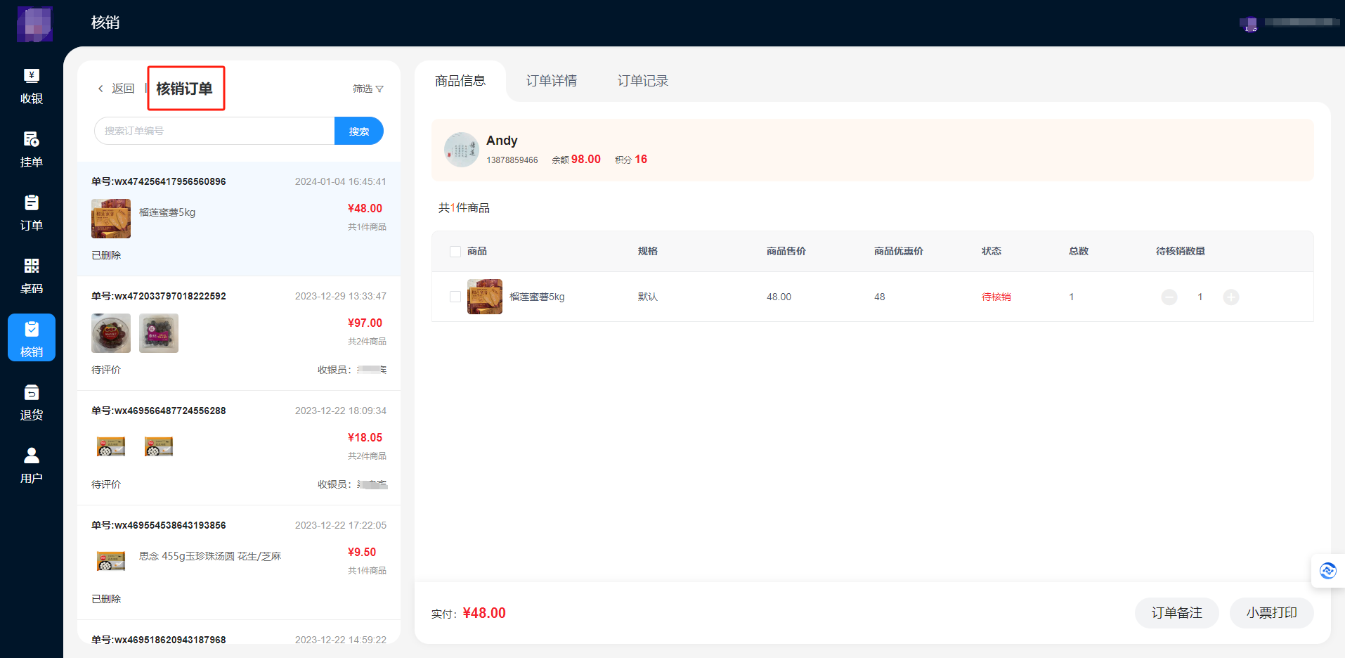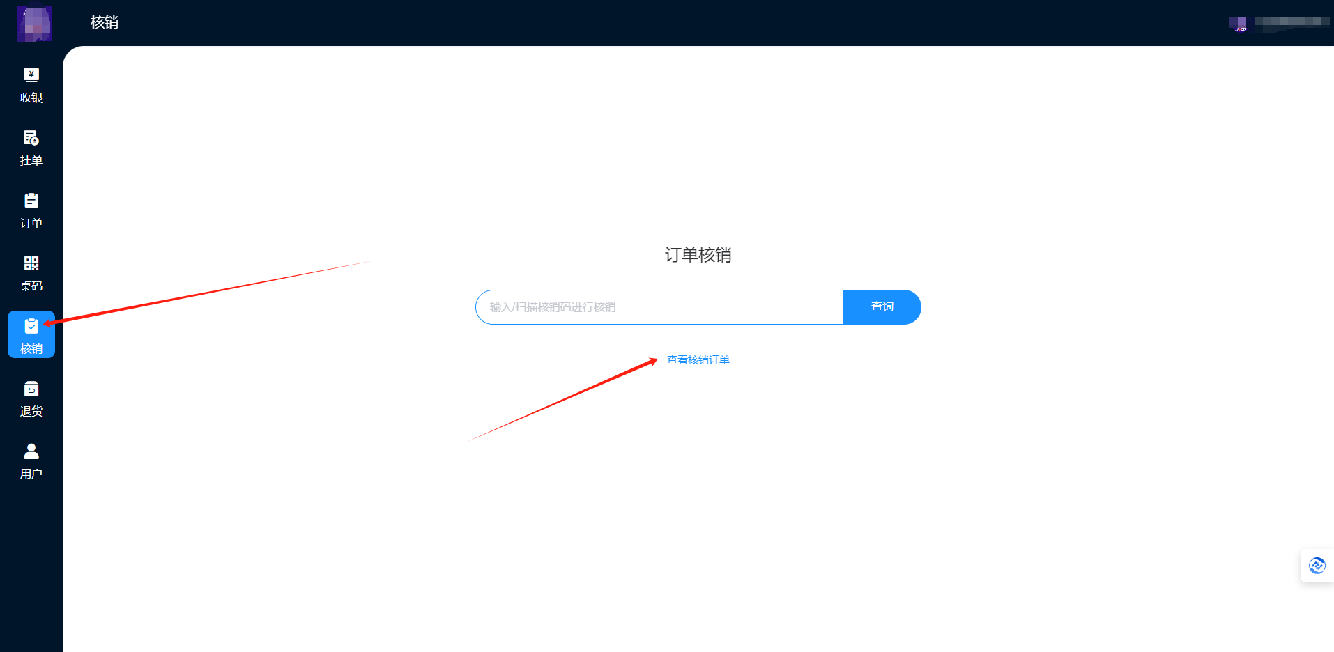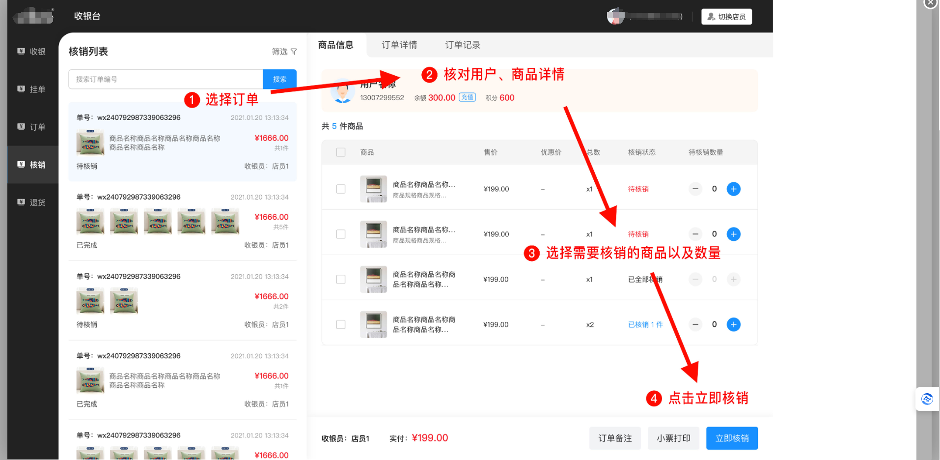 ##核销 ###一、功能介绍 核销功能主要用于顾客到店消费的情况,在操作台核销界面中,保存着所有核销订单的信息,同样也可以查看订单商品信息、订单详情、订单记录等信息。 ###二、操作流程 收银台 > 核销   ###三、步骤演示