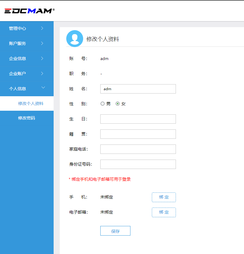 ##### 请使用电脑操作 ##### 请使用电脑操作 ##### 请使用电脑操作 ------------ #### step1、登录系统后台 后台域名:https://i.edcmam.net 具体教程请查阅[【账号登录】](https://doc.edcmam.com/EDCMAM_SaaS/account/367 "【账号登录】") #### step2、在左侧菜单中,选择【个人信息】-【修改个人资料】 如下图: