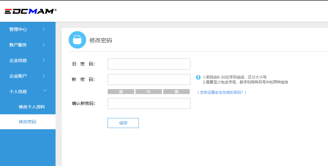 ##### 请使用电脑操作 ##### 请使用电脑操作 ##### 请使用电脑操作 ------------ #### step1、登录系统后台 后台域名:https://i.edcmam.net 具体教程请查阅[【账号登录】](https://doc.edcmam.com/EDCMAM_SaaS/account/367 "【账号登录】") #### step2、在左侧菜单中,选择【个人信息】-【修改密码】 如下图: